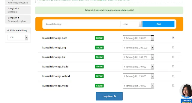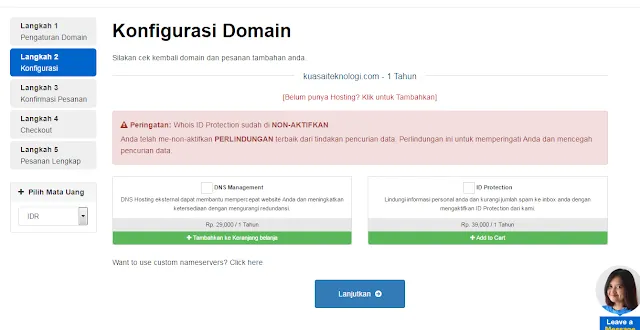 - pada gambar di atas domain .com buat saya masih tersedia kemudian pilih yang massa aktip 1 tahun dan centang setelah di pilih dan di centang kemudian klik lanjjutkan, tampillannya akan seperti berikut: