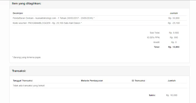 nah pada halaman di atas terlihat tagihan domain yang anda beli tadi di sana ada tertera no rekening dll